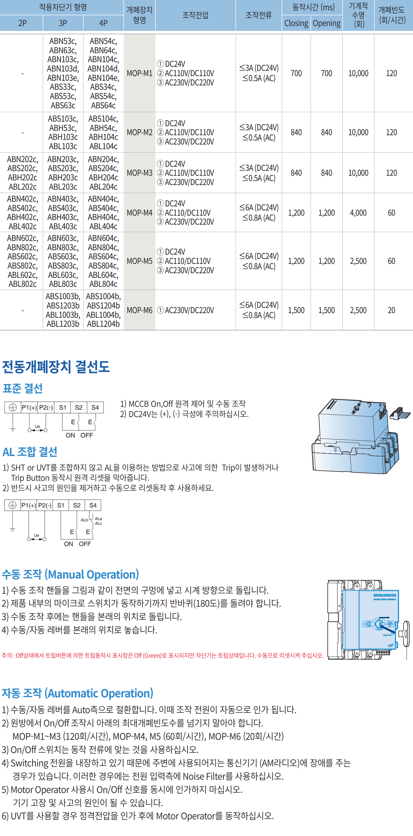 | Note | MOP-M1 : 30~100AF MOP-M2 : 125AF MOP-M3 ; 250AF MOP-M4 : 400AF MOP-M5 : 630~800AF MOP-M6 : 1000~1200AF |