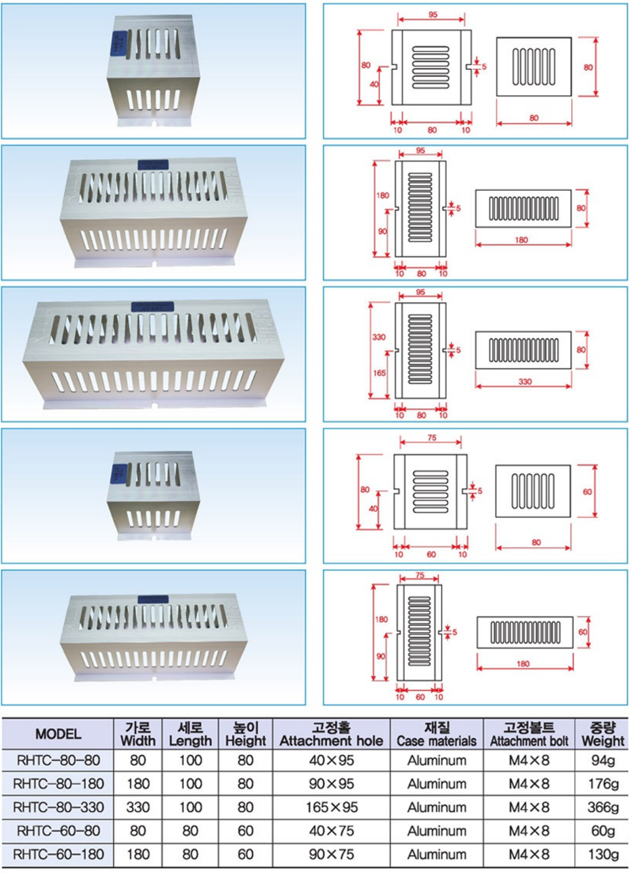 | 사이즈 및 라인업 | RHTC-60-80: 80(W) x 80(L) x 60(D) RHTC-60-180 : 80(W) x 80(L) x 60(D) |