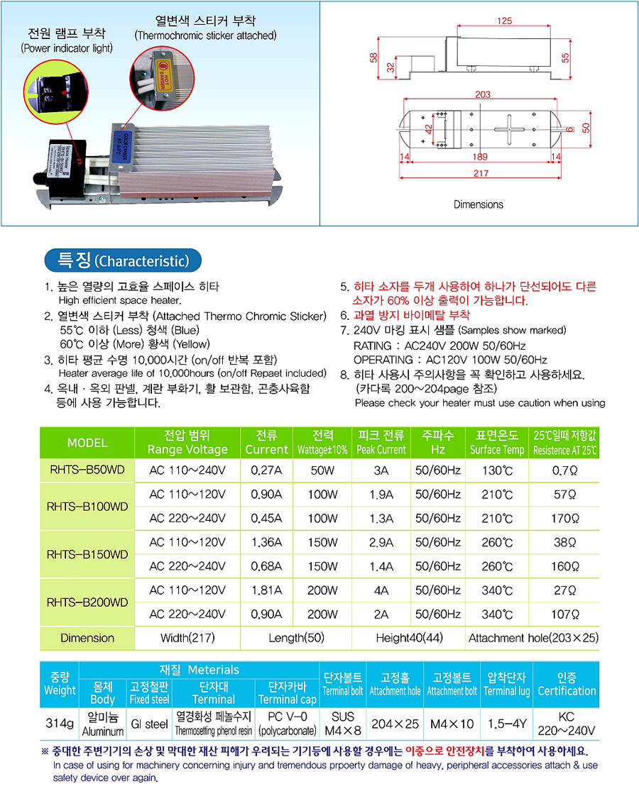 | 표면온도 | RHTS-B50WD : 130°C RHTS-B100WD : 210°C RHTS-B150WD : 260°C RHTS-B200WD : 340°C |