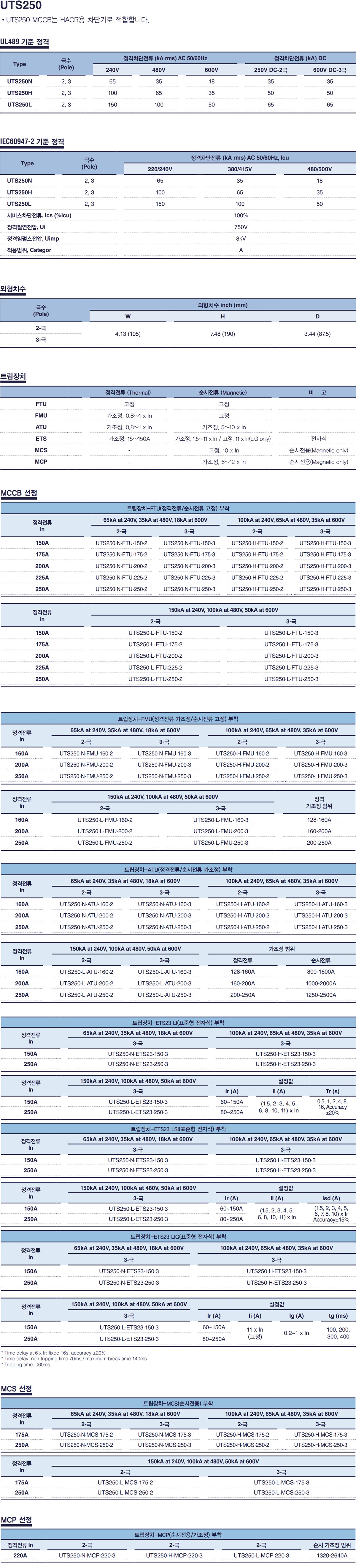 | Trip Unit | ETS23 LI > li : 순시 트립전류 설정다이얼 tr : 장한시 트립시간 설정다이얼 lr : 장한시 트립전류 설정다이얼 ETS23 LIG > tg : 지락 트립시간 설정다이얼 lg : 지락 트립전류 설정다이얼 lr : 장한시 트립전류 설정다이얼 ETS23 LSI > li : 순시 트립전류 설정다이얼 lsd : 단한시 트립전류 설정다이얼 lr : 장한시 트립전류 설정다이얼 |