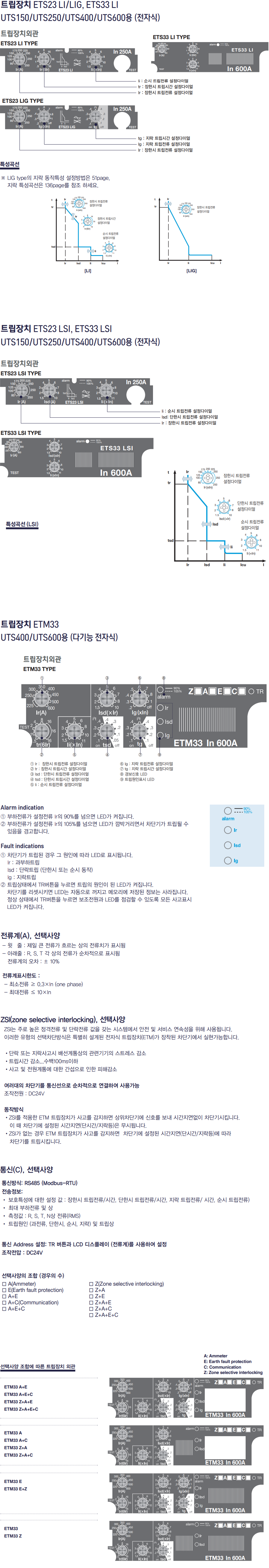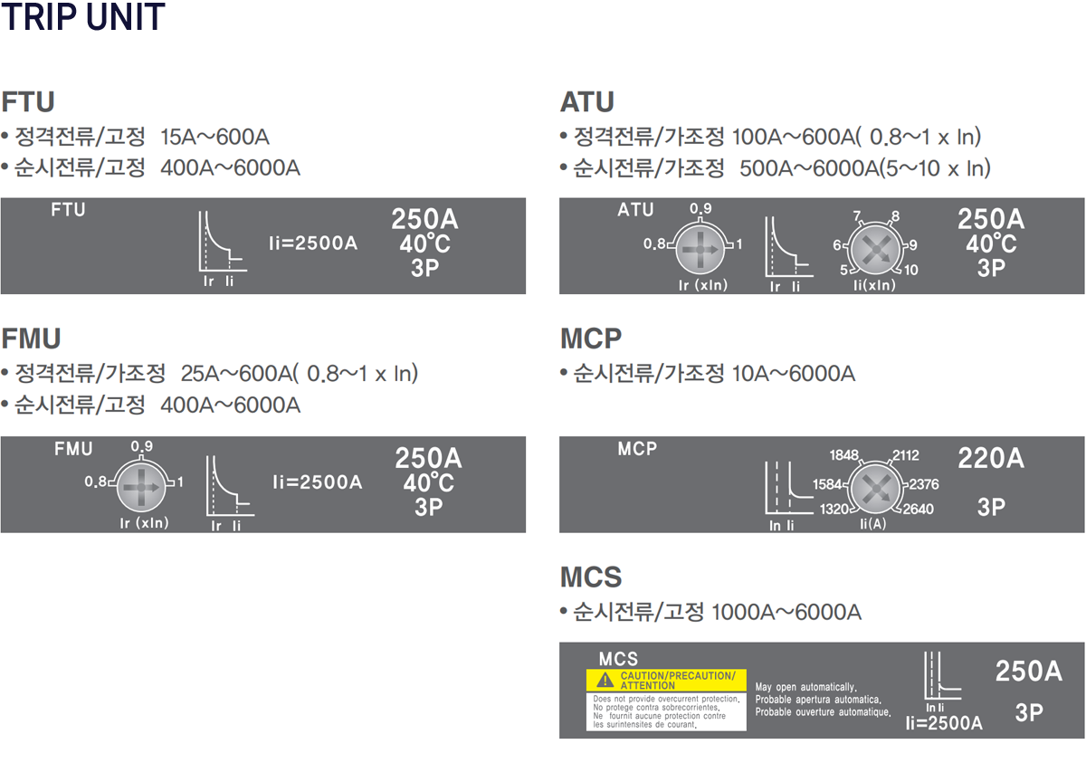 | Trip Unit | FTU - 정격/순시고정 FMU - 정격 가조정(0.8~1) / 순시 고정 ATU - 정격 가조정(0.8-1) / 순시 가조정 (5~10) ETS - 표준형 전자식, li / tr / lr / tg / lg / lsd MCS - 순시형/순시전류 고정 MCP - 순시형/순시전류 가조정 |