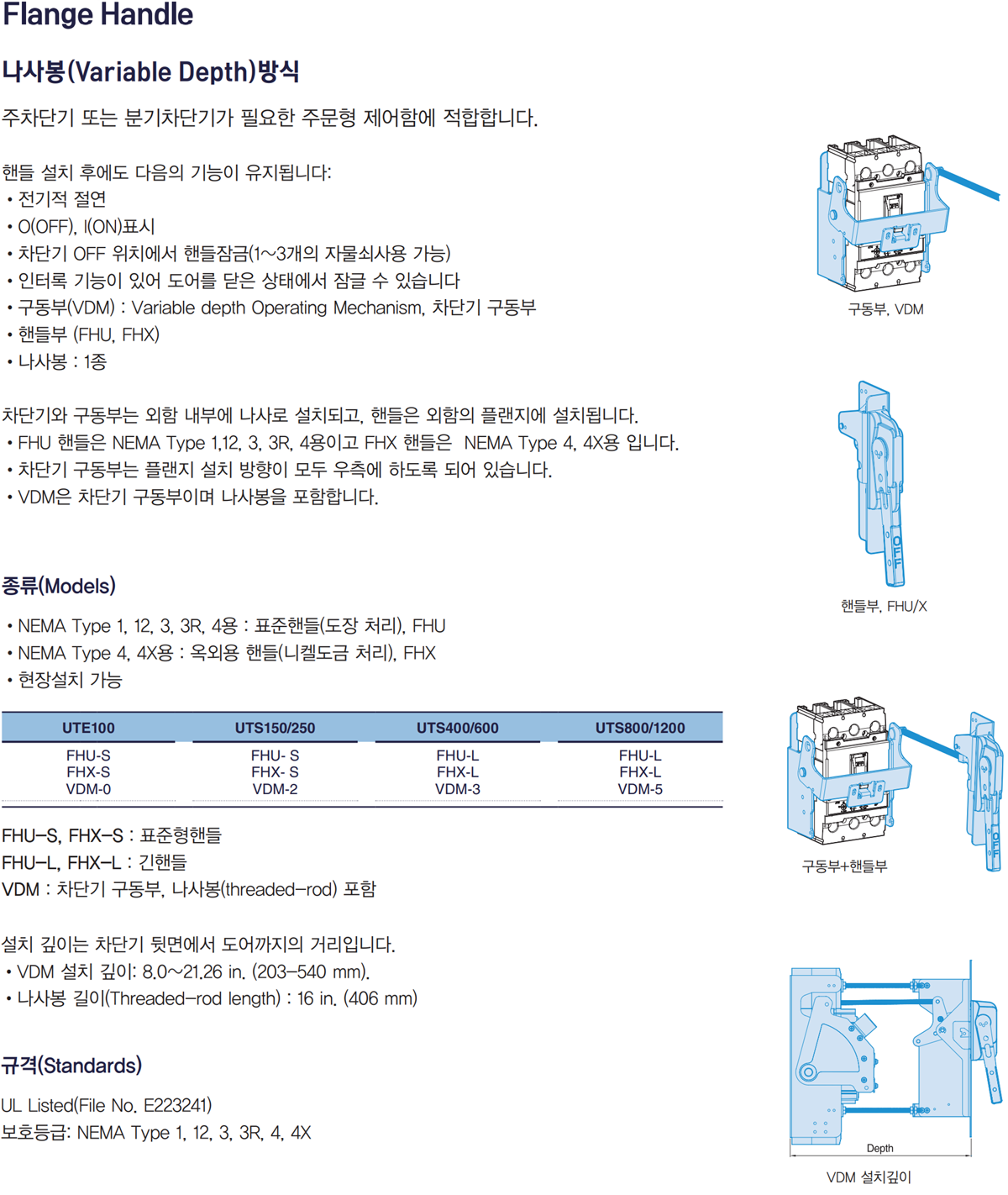 | Line Up | NEMA 1, 12, 3, 3R, 4 type VDM0/FHU-S : for UTE100 VDM2/FHU-S : for UTS150 / UTS250 VDM3/FHU-L : for UTS400 / UTS600 VDM5/FHU-L : for UTS800 / UTS1200 / NEMA 4, 4X type VDM0/FHX-S : for UTE100 VDM2/FHX-S : for UTS150 / UTS250 VDM3/FHX-L : for UTS150 / UTS250 VDM5/FHX-L : for UTS800 / UTS1200 |