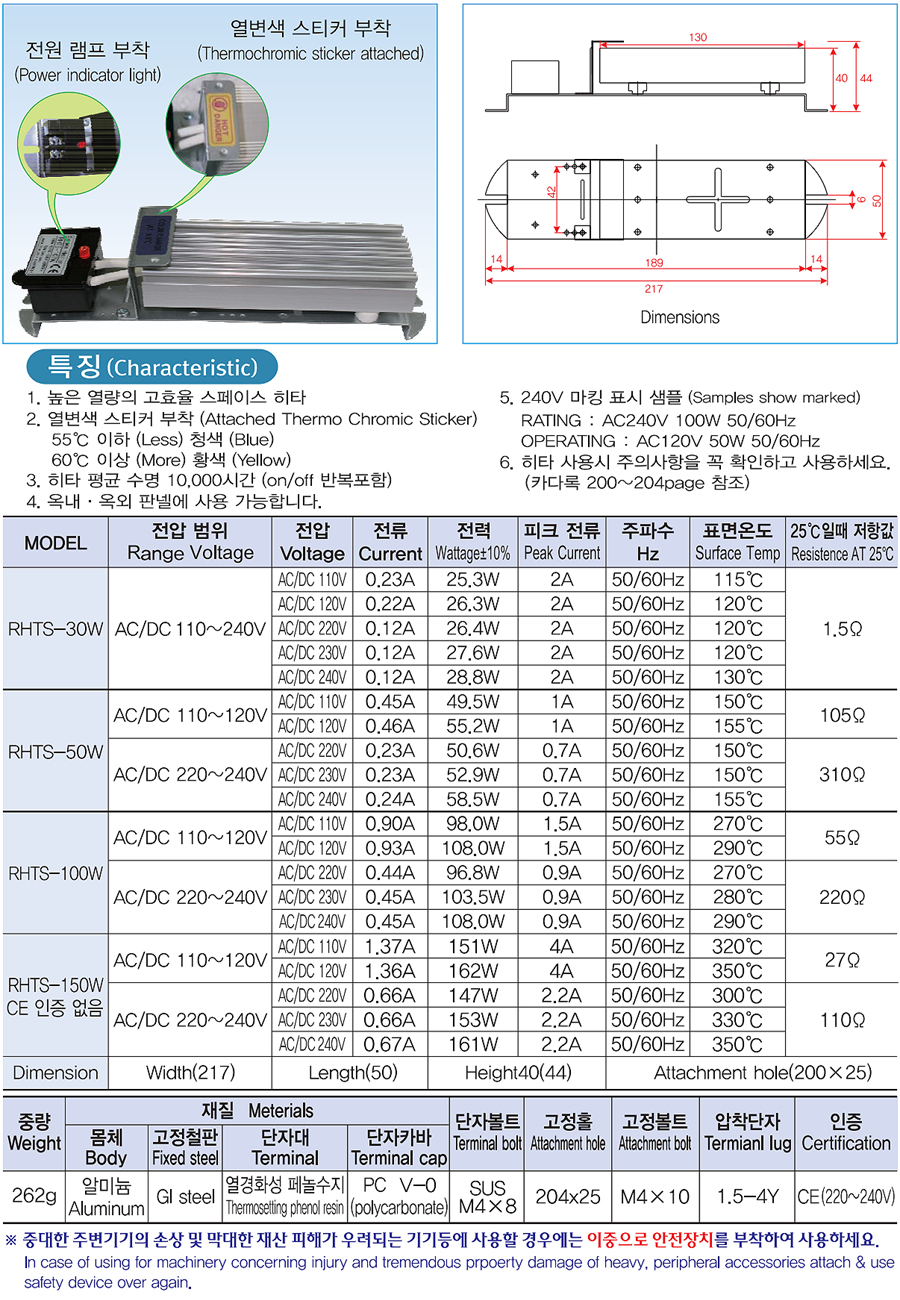 | 표면온도 | RHTS-30W : 120°C RHTS-50W : 150°C RHTS-100W : 270°C RHTS-150W : 330°C |